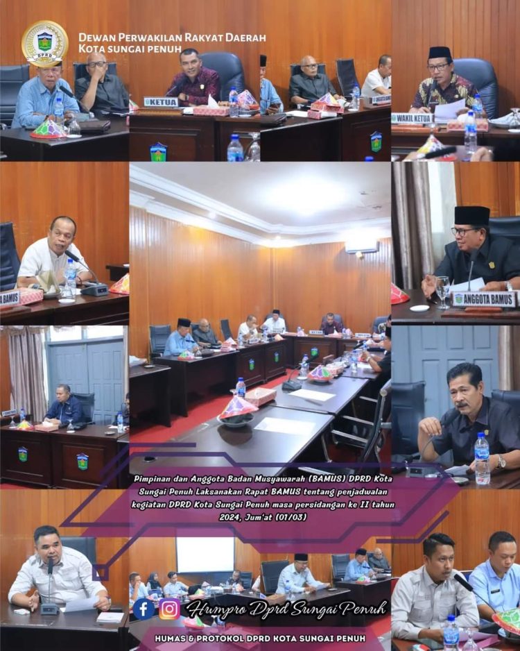 VisuaLJambi, SUNGAI PENUH – Pimpinan dan Anggota Badan Musyawarah (BAMUS) DPRD Kota Sungai Penuh Laksanakan Rapat BAMUS tentang penjadwalan kegiatan DPRD Kota Sungai Penuh masa persidangan ke II tahun 2024, Jum’at (01/03)