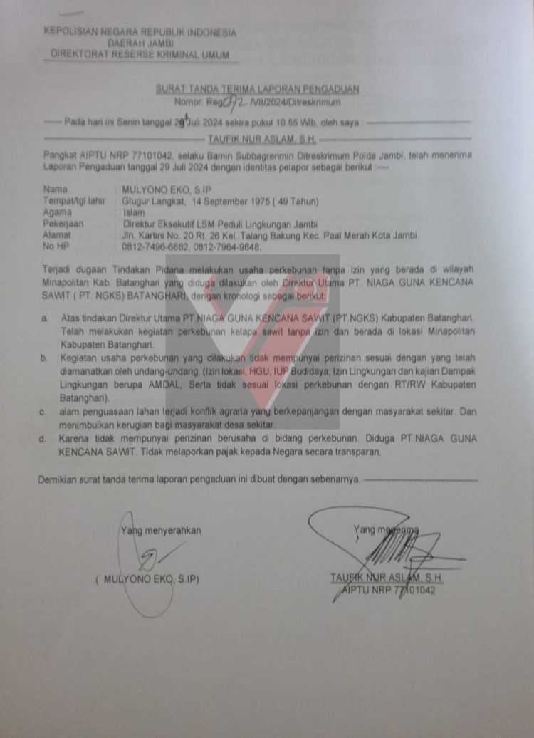 Direktur Eksekutif Peduli Lingkungan Jambi Eko. Dikonfirmasi awak media, melalui selulernya membenarkan telah melaporkan Direktur Utama PT.Niaga Guna Kencana Sawit ( PT.NGKS ) Ke Polda Jambi. Eko menyampaikan. Atas laporan ini diharapkan penegak hukum dapat melakukan tindakan yang profesional, terukur dan berpihak kepada yang benar.