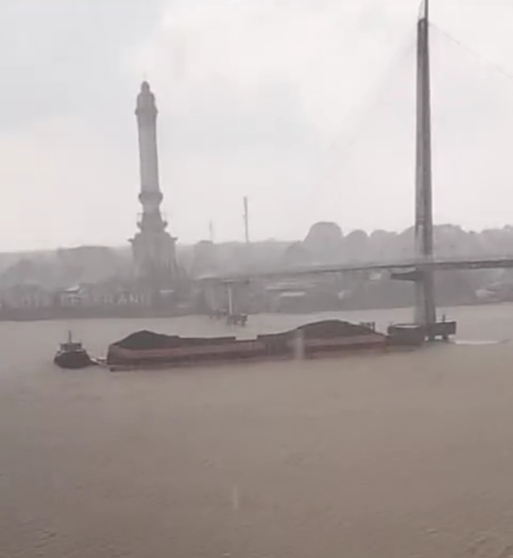 Suara laki-laki yang menyaksikan kejadian tersebut terdengar jelas, ‘Numbur, numbur, nah tongkang numbur jembatan gentala arasy kejadian hujan hujan sungai batanghari, selesai.’ teriaknya dari visual suara video.