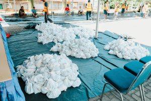Gotong royong penyaluran juga dilakukan oleh panitia yang terdiri dari karyawan, tokoh masyarakat, hingga relawan yang membantu proses pemotongan, pengemasan, dan distribusi paket.