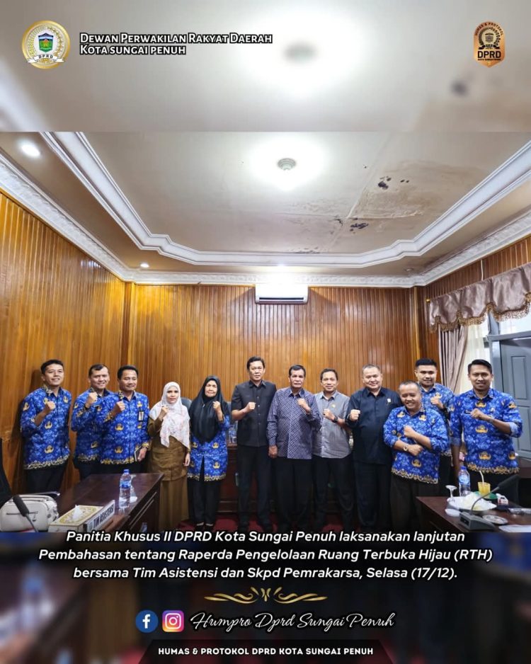 VisualJambi, SUNGAI PENUH – Panitia Khusus II DPRD Kota Sungai Penuh laksanakan lanjutan Pembahasan tentang Raperda Pengelolaan Ruang Terbuka Hijau (RTH) bersama Tim Asistensi dan Skpd Pemrakarsa, Selasa (17/12).