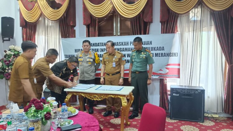 VisualJambi, Bangko. – Penjabat (Pj) Bupati Merangin H Mukti menandatangani Naskah Perjanjian Hibah Daerah (NPHD), untuk pendanaan kegiatan Pemilukada tahun 2024, di Ruang tengah rumah dinas bupati Merangin, Senin (29/4).