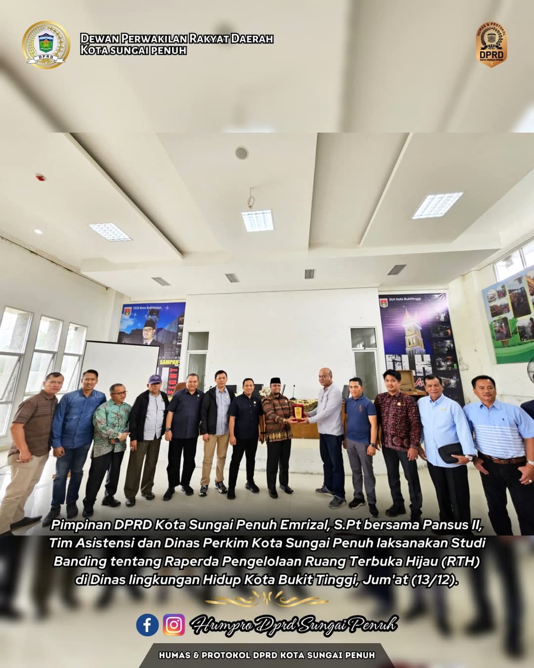 VisualJambi, BUKIT TINGGI – Pimpinan DPRD Kota Sungai Penuh Emrizal, S.Pt bersama Pansus II, Tim Asistensi dan Dinas Perkim Kota Sungai Penuh laksanakan Studi Banding tentang Raperda Pengelolaan Ruang Terbuka Hijau (RTH) di Dinas lingkungan Hidup Kota Bukit Tinggi, Jum’at (13/12).
