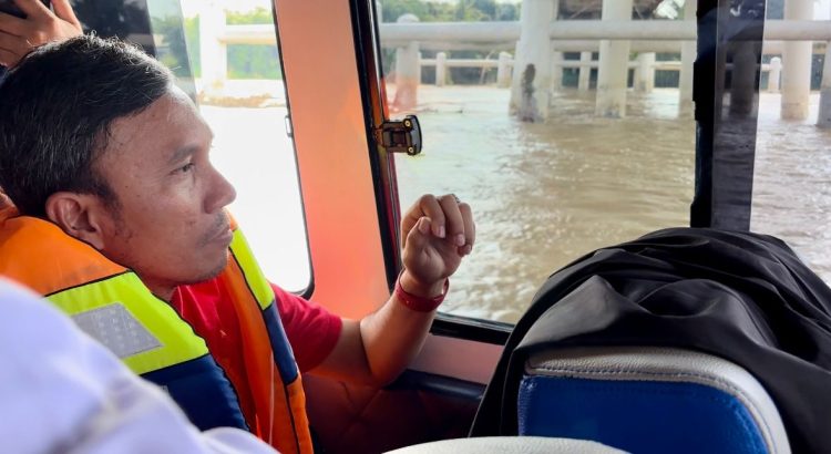 VisuaLJambi, Kota Jambi. – Ketua DPRD Provinsi Jambi, Edi Purwanto langsung melakukan peninjauan ke lokasi Jembatan Aurduri 1 yang sempat viral lantaran tiang pengaman jembatan yang ditabrak oleh kapal tongkang dengan muatan batubara, Sabtu (18/5). Edi Purwanto melakukan penijauan dengan menggunakan kapal speadboat sehingga langsung secara jelas melihat bagaimana kondisi di tiang jembatan Aurduri 1.