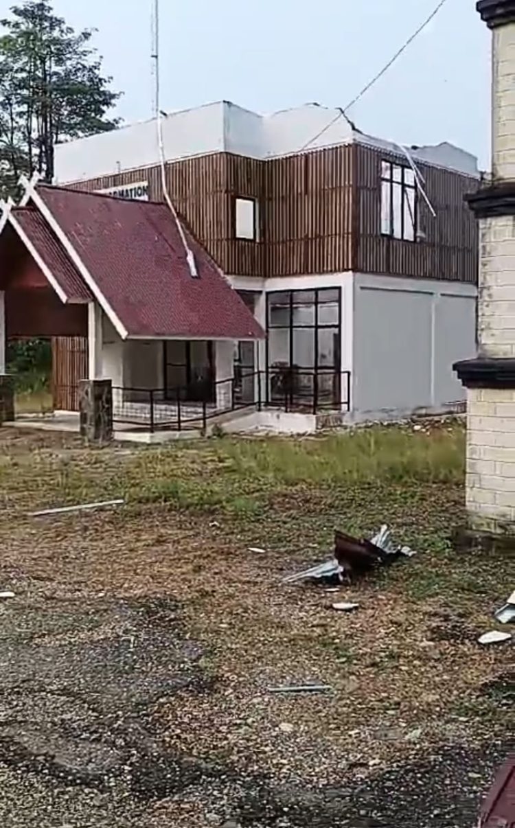 VisualJambi, Merangin. – Viral, Hancur berantakan atap rangka baja ringan di gedung baru TIC (Tourist Information Centre) akibat hujan angin beberapa malam yang lalu.
