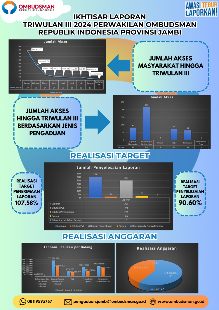 Sampai saat ini, ORI Jambi sudah menerima 400 akses pengaduan sepanjang tahun 2024 dari target 277 laporan. Jumlah tersebut terhitung dari awal tahun hingga September 2024.